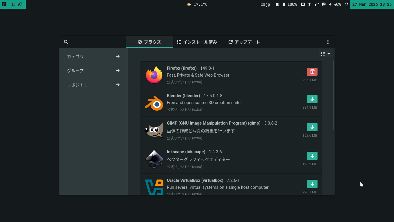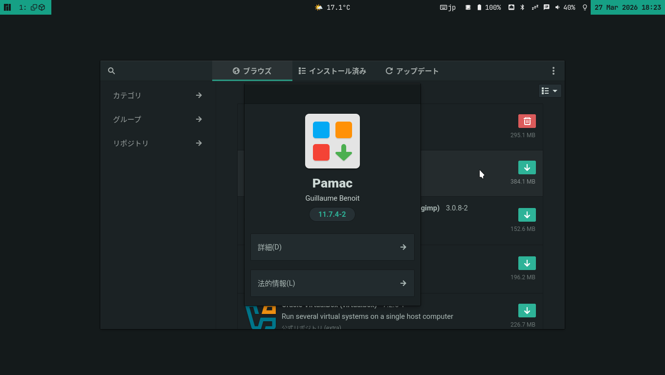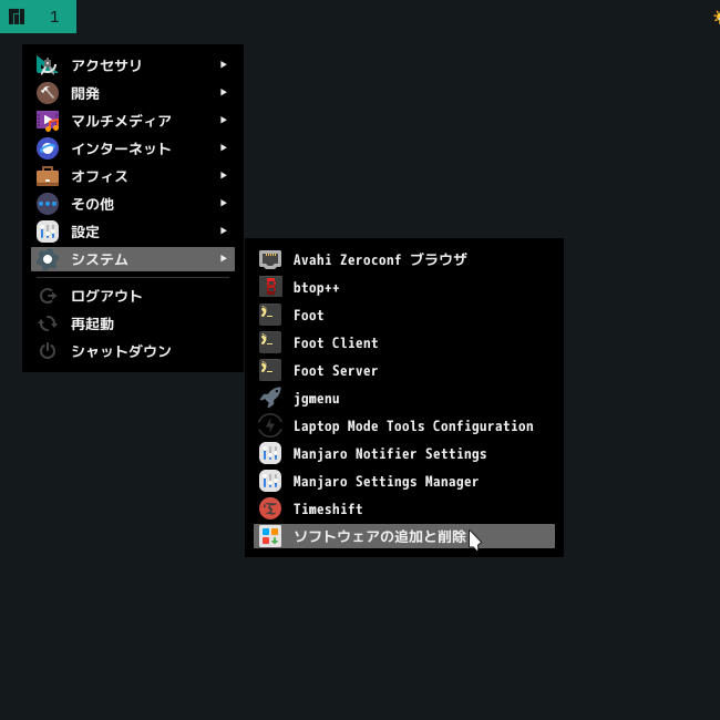 1. 概要 「Pamac」は、パッケージ管理フロントエンドプログラムです。 操作等については、「Linux - 共通事項 - パッケージ管理フロントエンド」をご参照ください。 2. 起動 「スタート」→「システム」→「ソフトウエアの追加と削除」