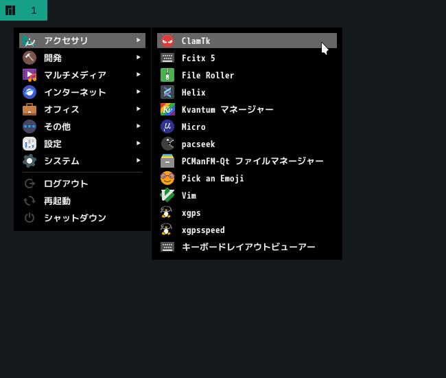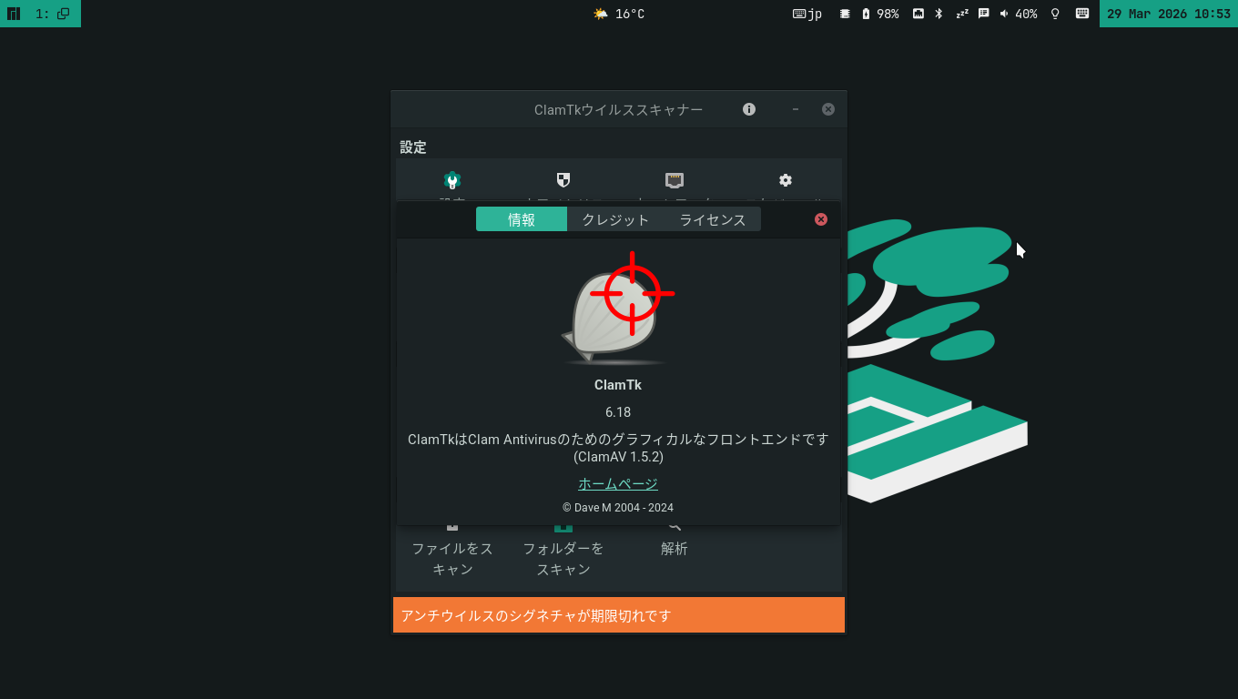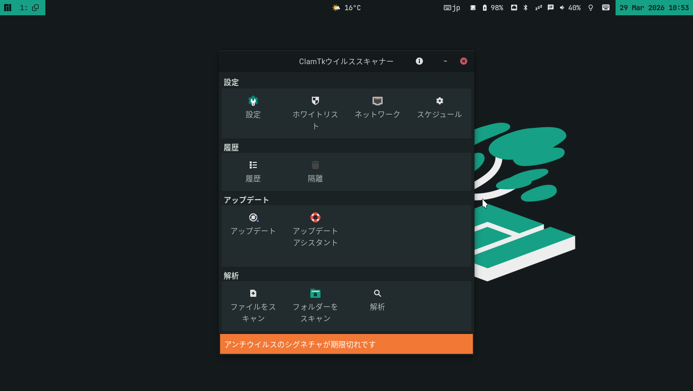 1. 概要 アンチウイルスソフトとして、「ClamTk」を使用します。 2. インストール 「root」ユーザ権限で。 yes | pacman -S clamtk 3. 起動 「スタート」→「アクセサリ」→「ClamTk」