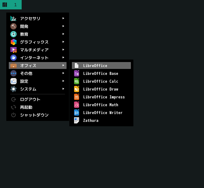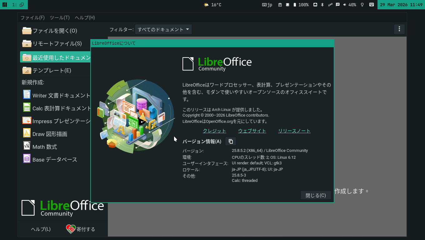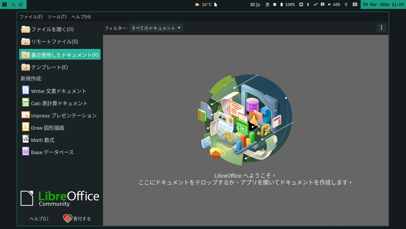 1. 概要 オフィススイートとして「LibreOffice」を使用します。 2. インストール 本体は、インストールされていますが、日本語化されていませんので、日本語化モジュールをインストールします。 「root」ユーザ権限で。 yes | pacman -S libreoffice-still-ja 3. 起動 「スタート」→「オフィス」→「LibreOffice」