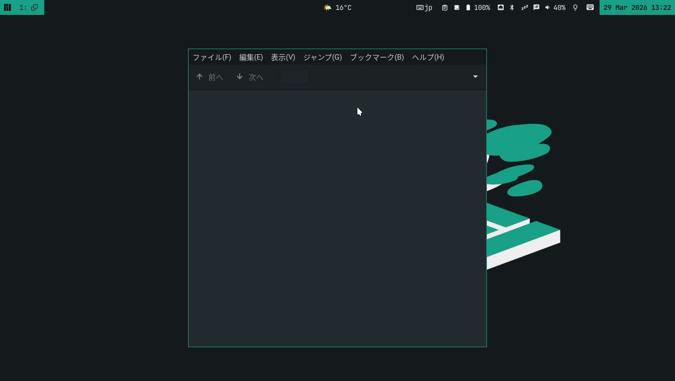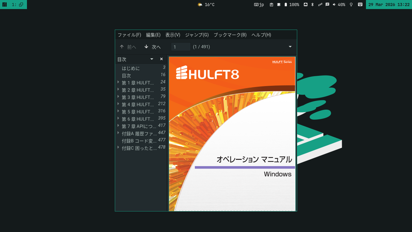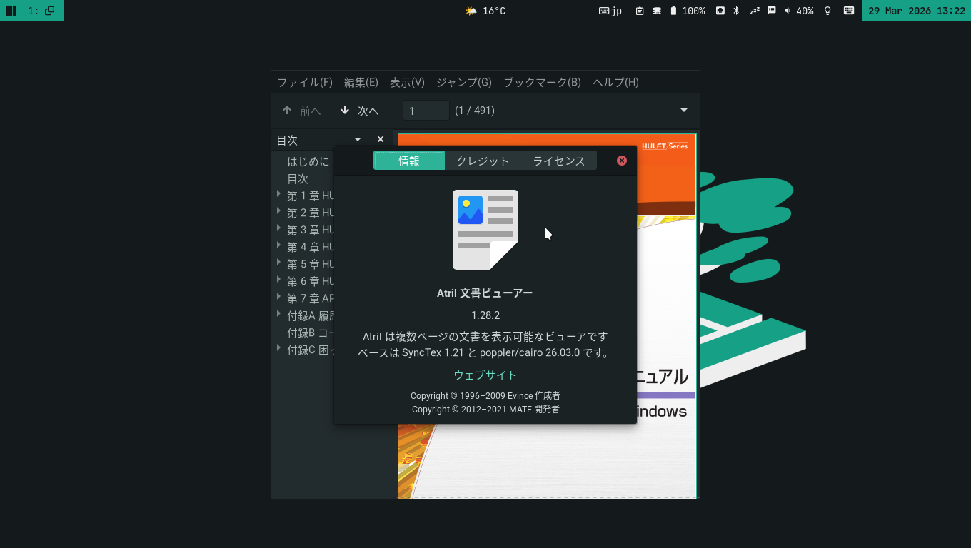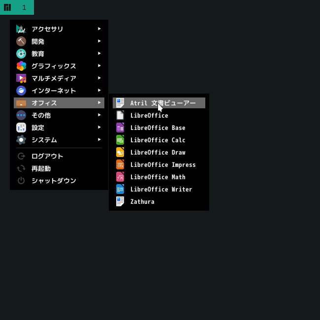 1. 概要 ドキュメントビューアとして、「Atril」を使用します。 2. インストール 「root」ユーザ権限で。 yes | pacman -S atril 3. 起動 「スタート」→「オフィス」→「Atril」