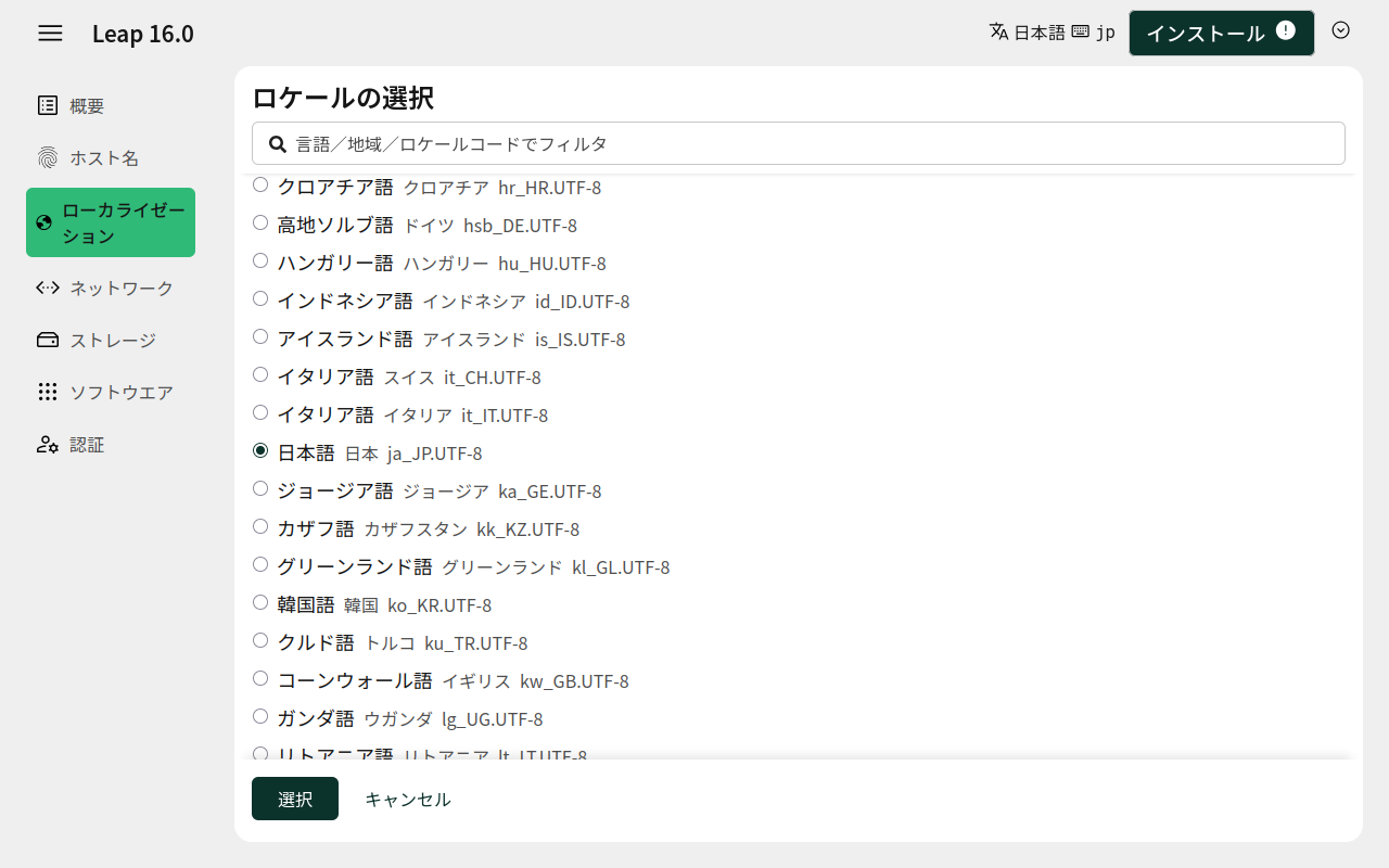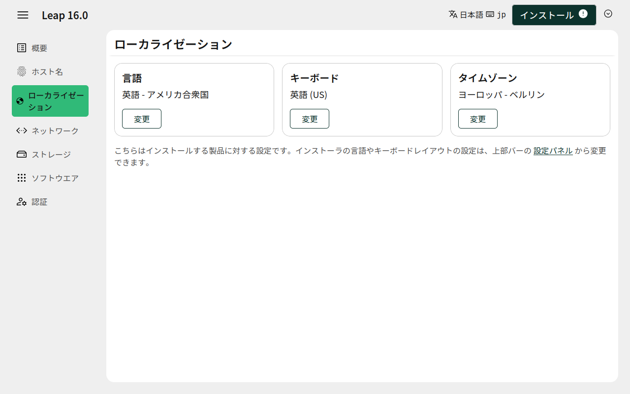 前項の設定は、インストーラの設定で、今度は、インストールするシステムのローカライズを行います。