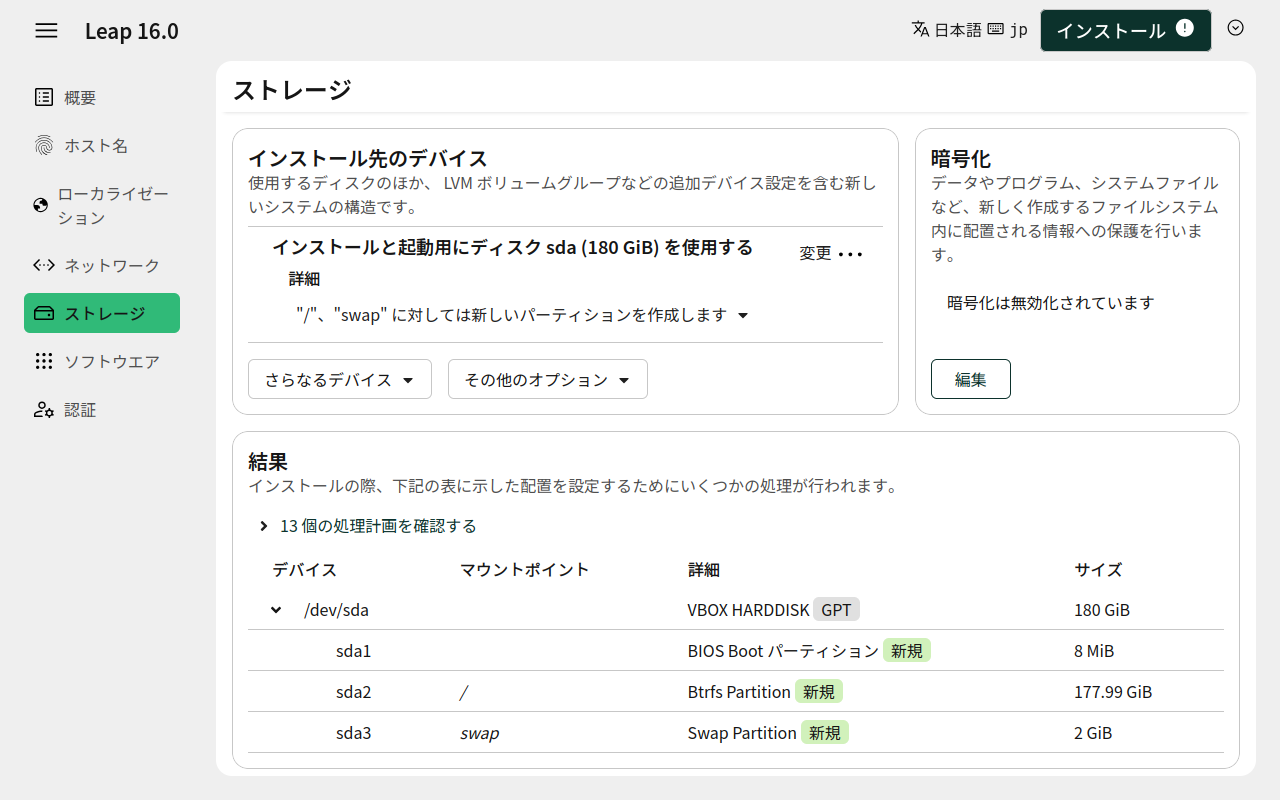 ハードディスクを追加したり、暗号化したりの設定があれば、ここで行います。