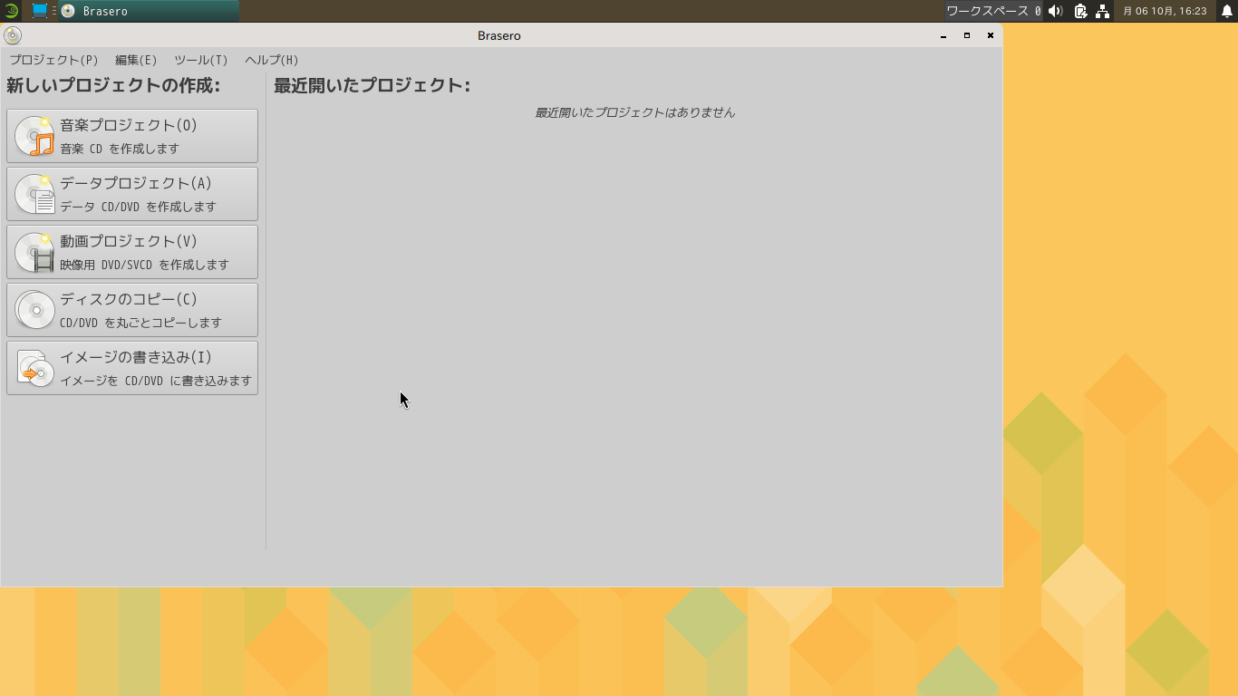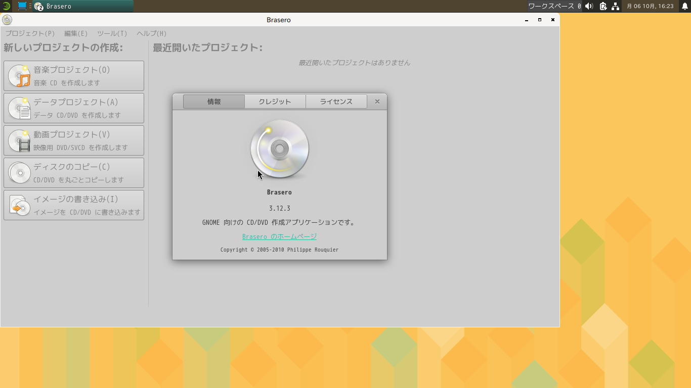1. 概要 光ディスク(CD・DVD)のライティングソフトとして、「Brasero」を使用します。 2. インストール 「root」ユーザ権限で。 zypper install -y brasero 3. 起動 「スタート」→「サウンドとビデオ」→「Brasero」
