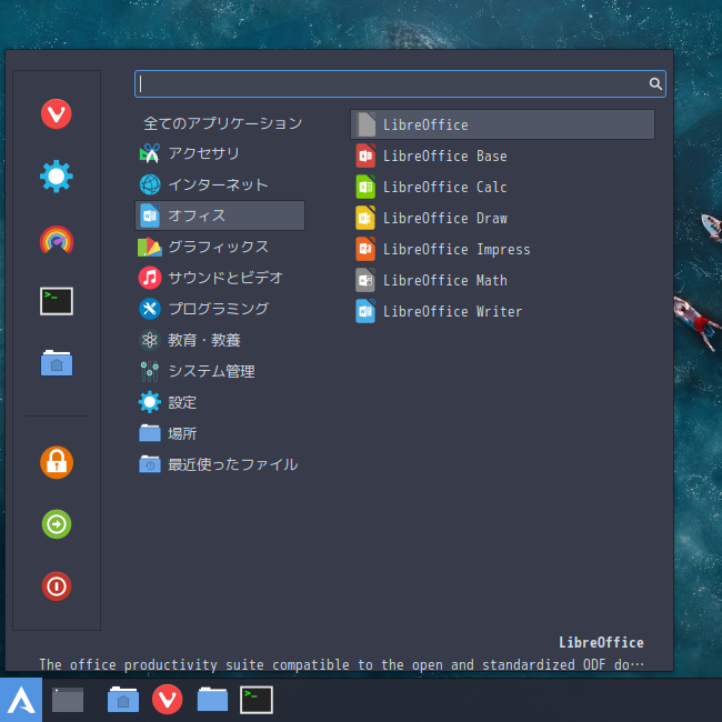 1. 概要 オフィススイートとして「LibreOffice」を使用します。 システムインストール時に選択していれば、デフォルトでインストールされていますが、日本語化されていません。 日本語化モジュールをインストールします。 こんなことなら、この時点でまとめてインストールしてもいいかもしれません。 2. インストール 「Pamac」で、「libreoffice-ja」を検索して、「libreoffice-still-ja」をインストールします。 3. 起動 「スタート」→「オフィス」→「LibreOffice」