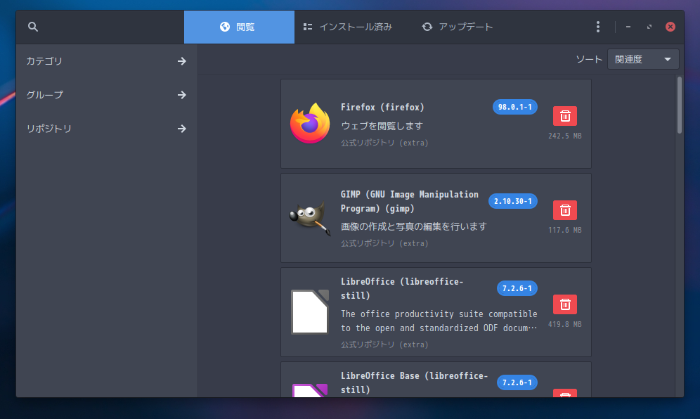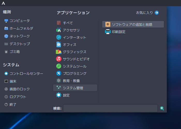 1. 概要 パッケージ管理フロントエンドとして「Pamac」を使用します。 2. 起動 「スタート」→「システム管理」→「ソフトウェアの追加と削除」