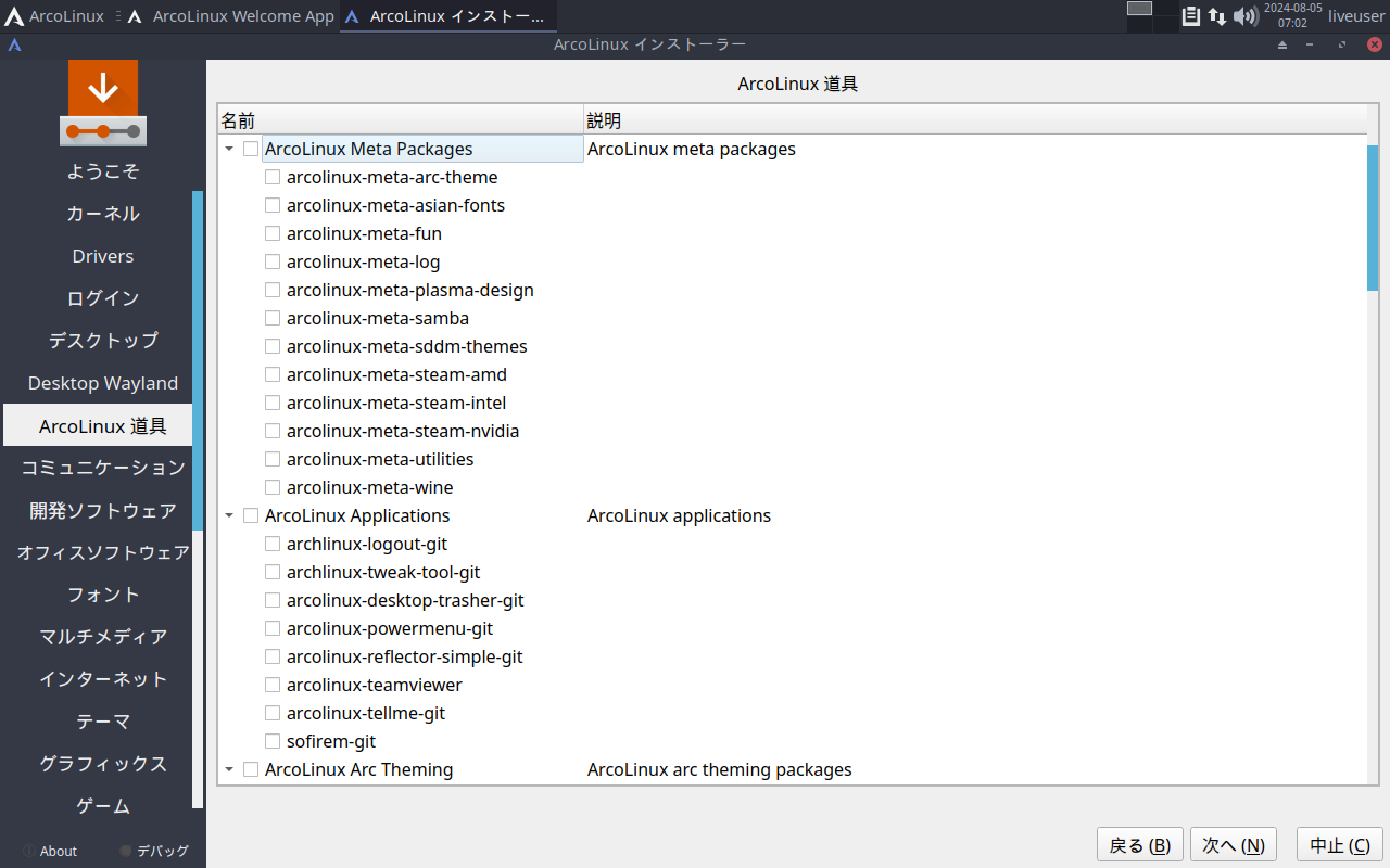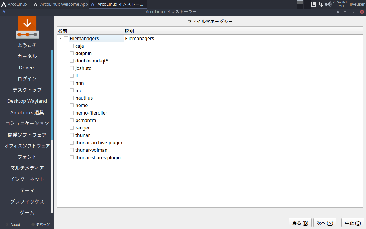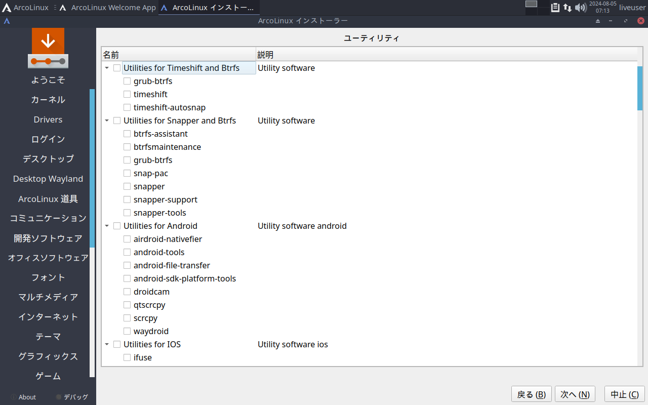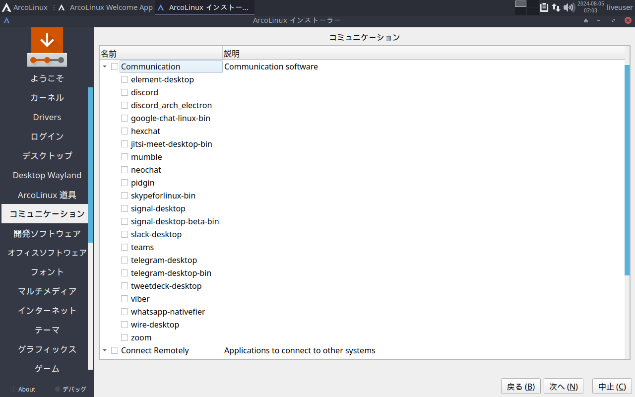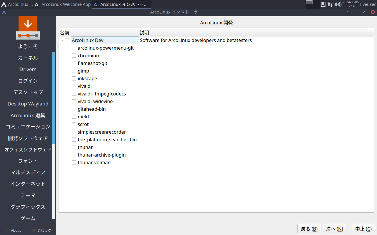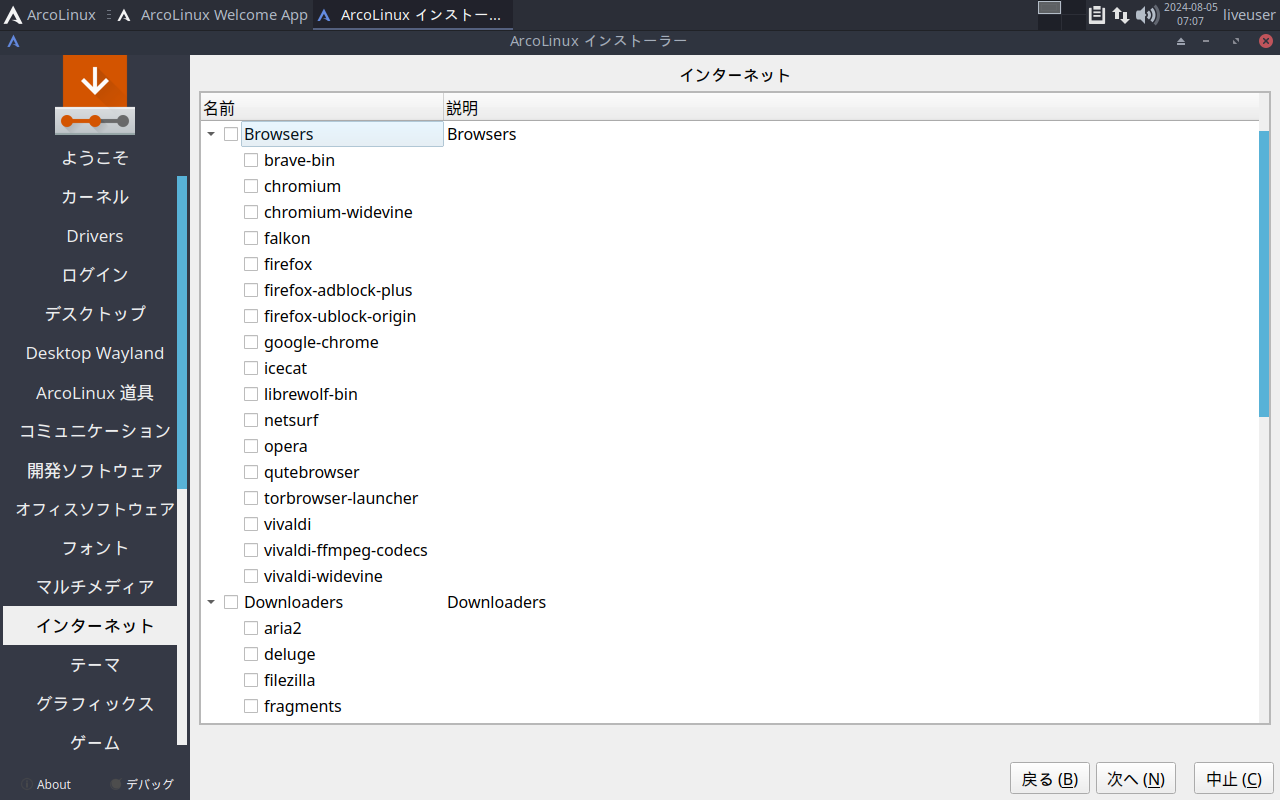 ここでは、「Browser」「Vivaldi」と「Mail Clients」「Thunderbird」をチェックして。