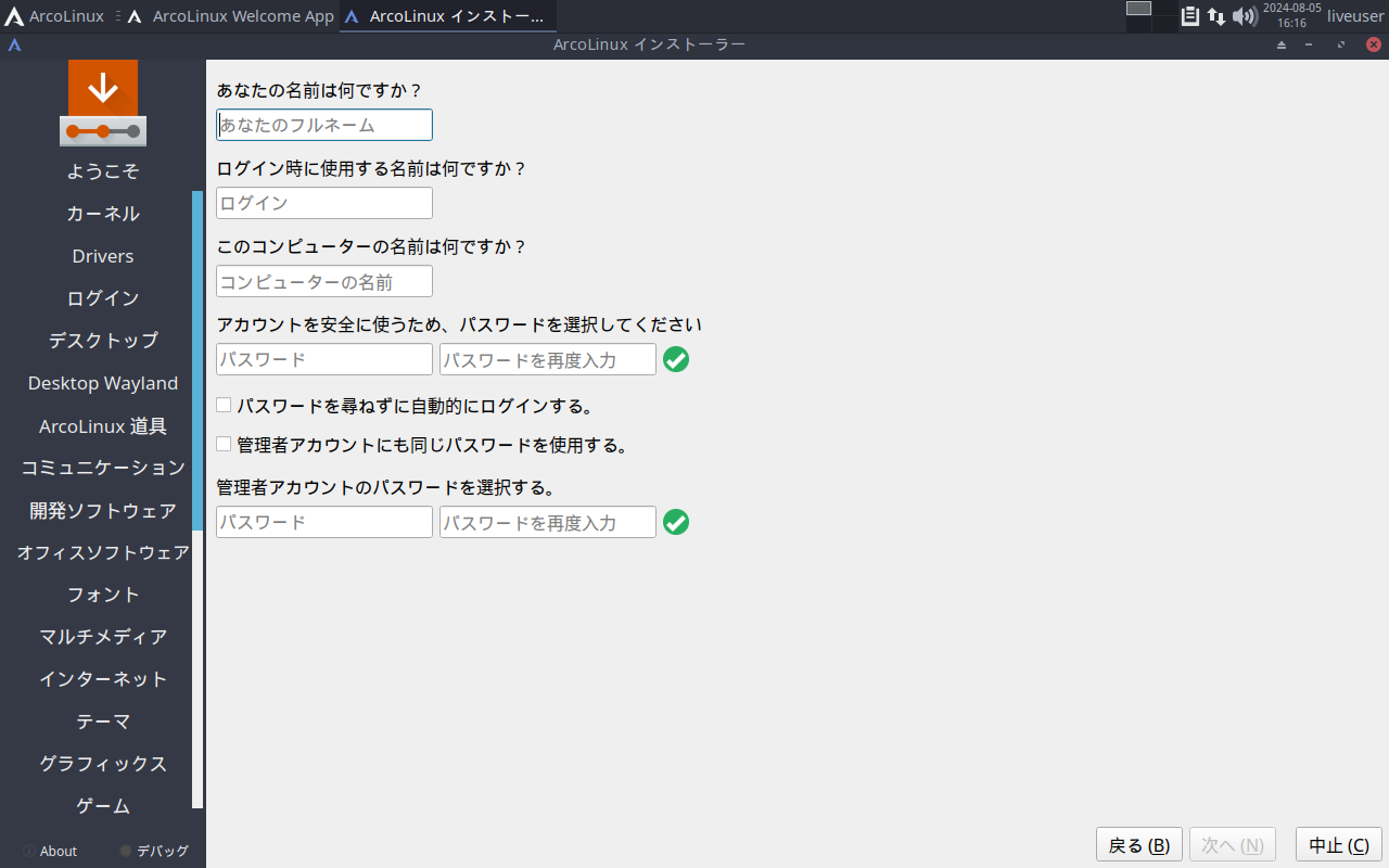 (好みにより「管理者アカウントと同じパスワードを使用する」のチェックをいれます)
