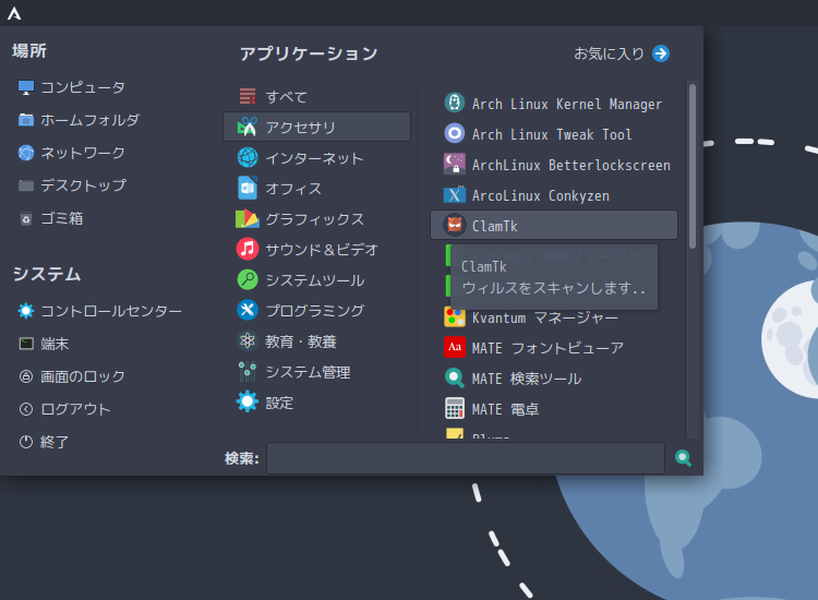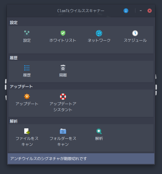 1. 概要 「ClamTk」は、「GUI」で操作するアンチウィルスソフトです。 2. インストール 「Pamac」で、「clamtk」を検索して、インストールします。 3. 起動 「スタート」→「アクセサリ」→「ClamTk」
