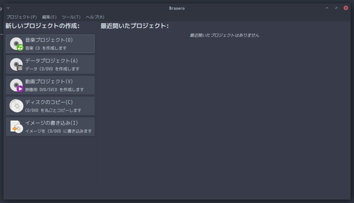 1. 概要 光ディスクライティングソフトとして、「Brasero」を使用します。 システムインストール時に選択していれば、デフォルトでインストールされています。 2. 起動 「スタート」→「サウンドとビデオ」→「Brasero」