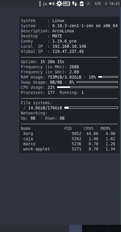 「ArcoLinux」では、「Conky」は、デフォルトでインストールされています。
