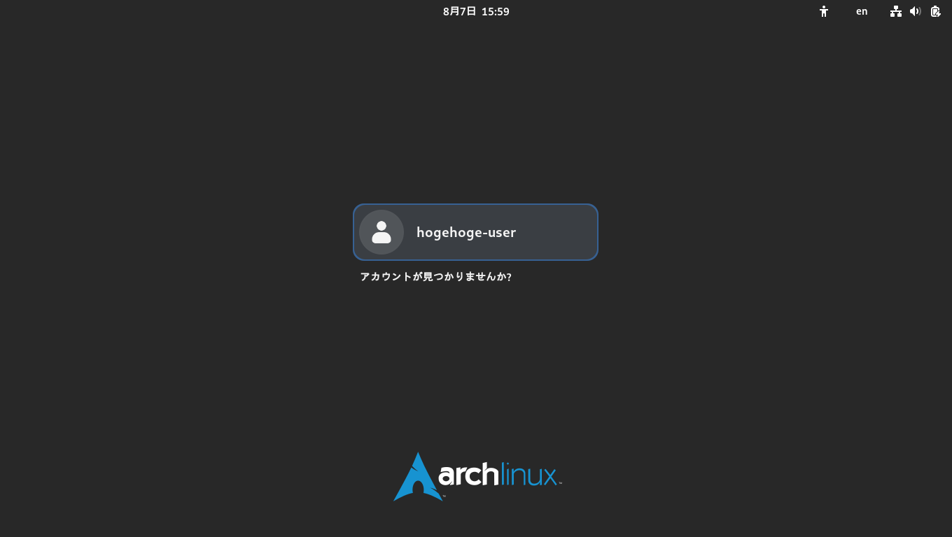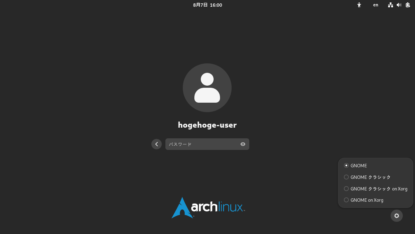 ログインの選択がいくつかありますが、「VirtualBox」へインストールしている場合は、「GNOME on Xorg」を選択してログインします。