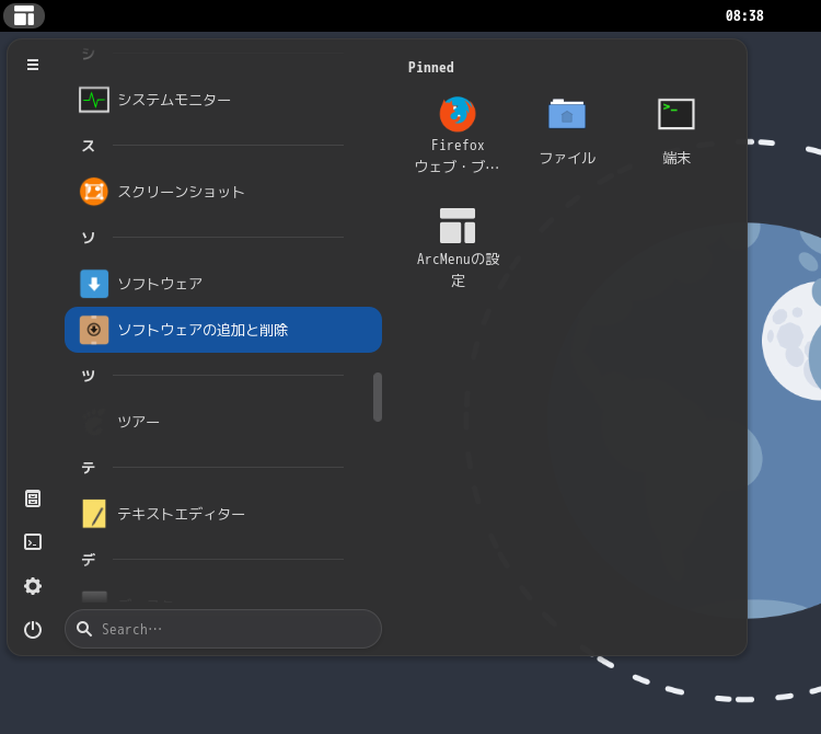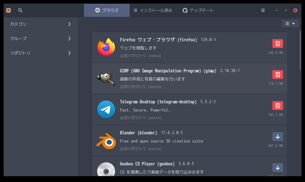 1. 概要 パッケージ管理フロントエンドとして、「Pamac」を使用します。 「ソフトウェア」と称する、「gnome-software」もインストールされていますが、ここでは紹介しません。 2. インストール 「root」ユーザ権限で。 yes | pacman -S pamac-aur 3. 起動 「スタート」→「ソ」→「ソフトウェアの追加と削除」