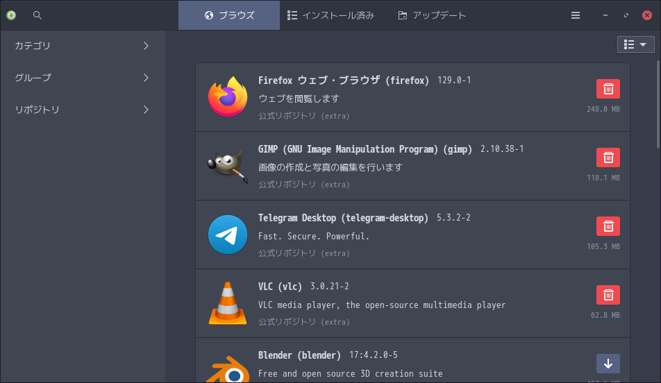 1. 概要 パッケージ管理フロントエンドとして「Pamac」を使用します。 2. インストール 「root」ユーザ権限で。 yes | pacman -S pamac-aur 3. 起動 「スタート」→「設定」→「ソフトウェアの追加と削除」