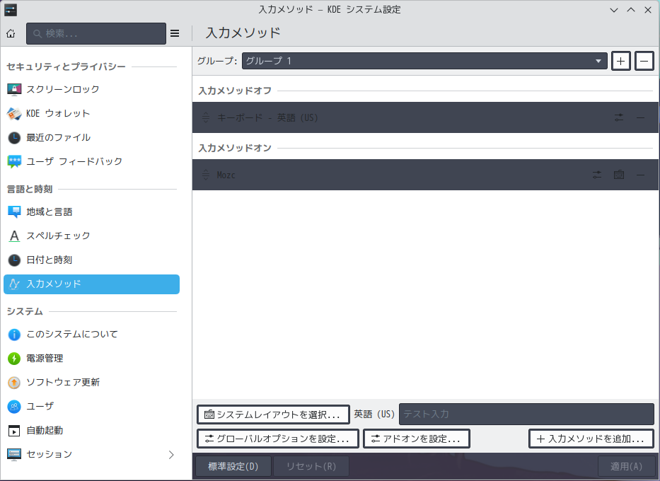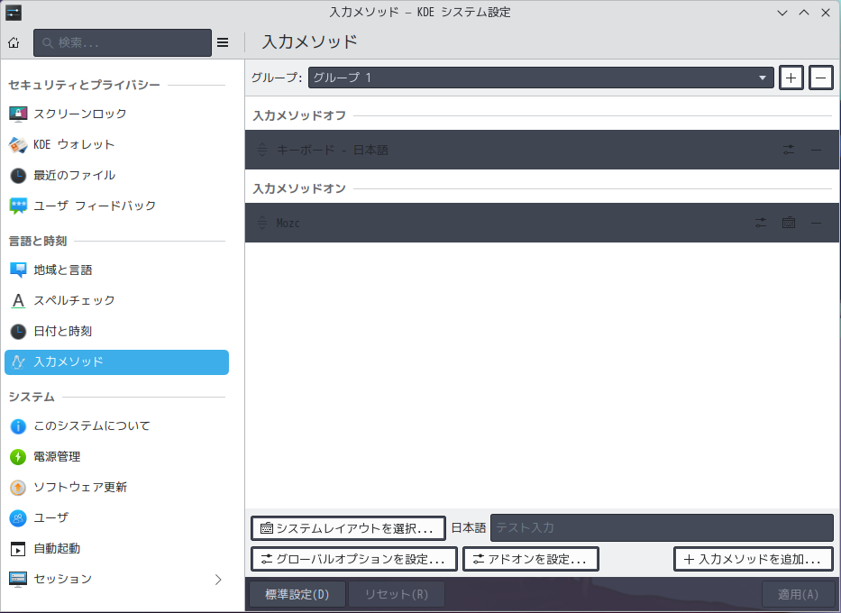 日本語入力として、「fcitx5-mozc」をインストールして使用します。