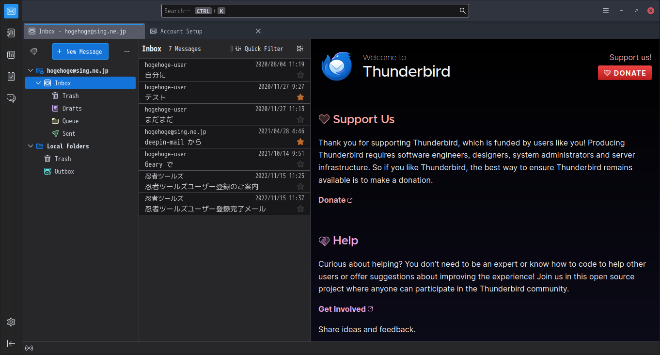 初回起動時は、「アカウント設定」が起動します。 起動直後に、受信ボックスを開いた状態です。 2024年8月9日の時点で、下記のバージョンでした。 日本語化を含め、操作方法等は「メールクライアント - Thunderbird」をご参照ください。 |