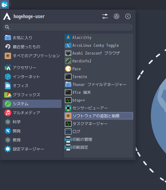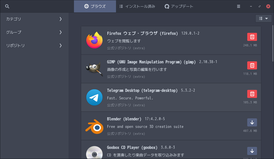 1. 概要 パッケージ管理フロントエンドとして「Pamac」を使用します。 2. インストール 「root」ユーザ権限で。 yes | pacman -S pamac-aur 3. 起動 「スタート」→「システム」→「ソフトウェアの追加と削除」