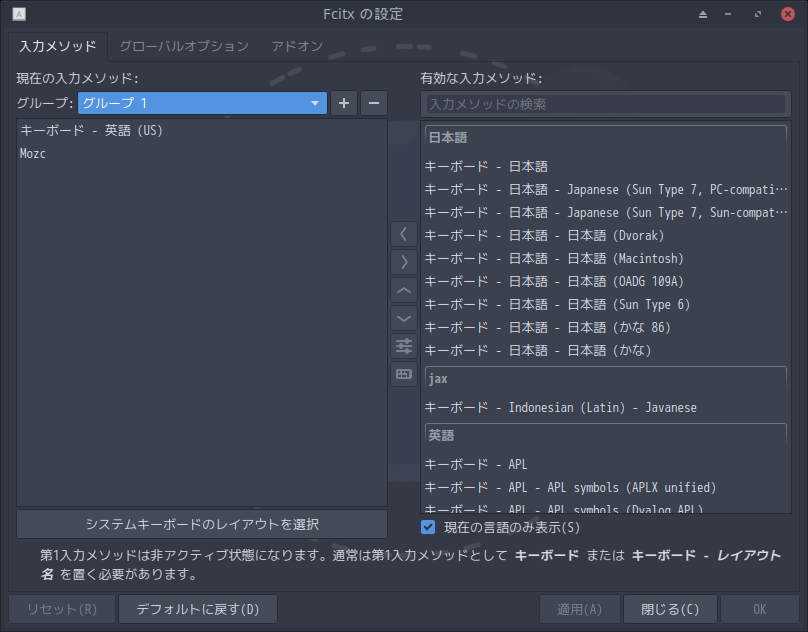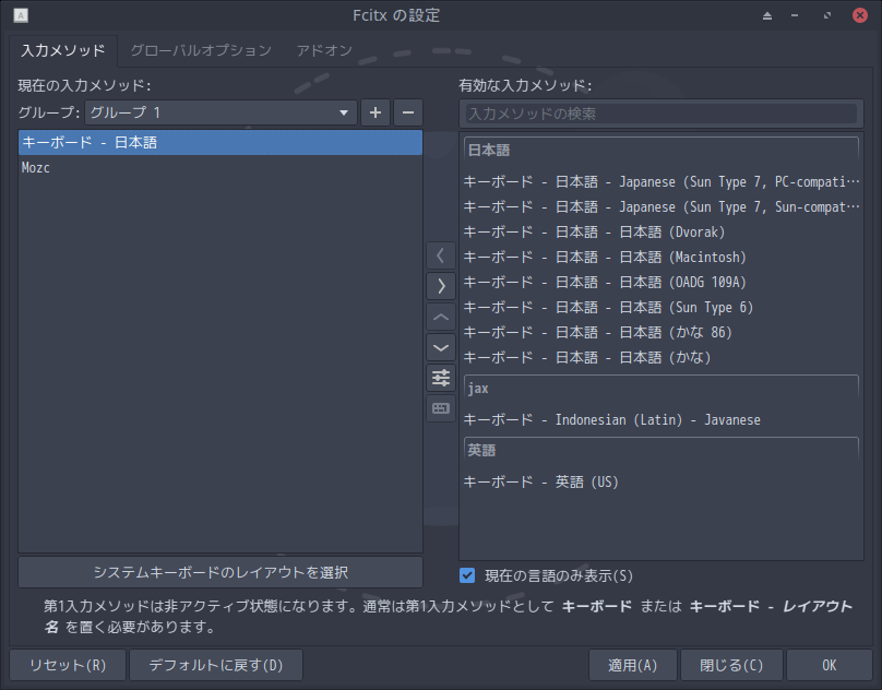 日本語入力として、「fcitx5-mozc」をインストールして使用します。