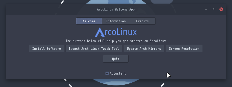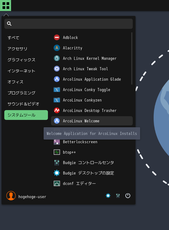 「スタート」→「システムツール」→「ArcoLinux Welcome」