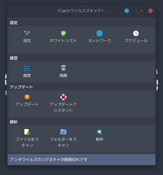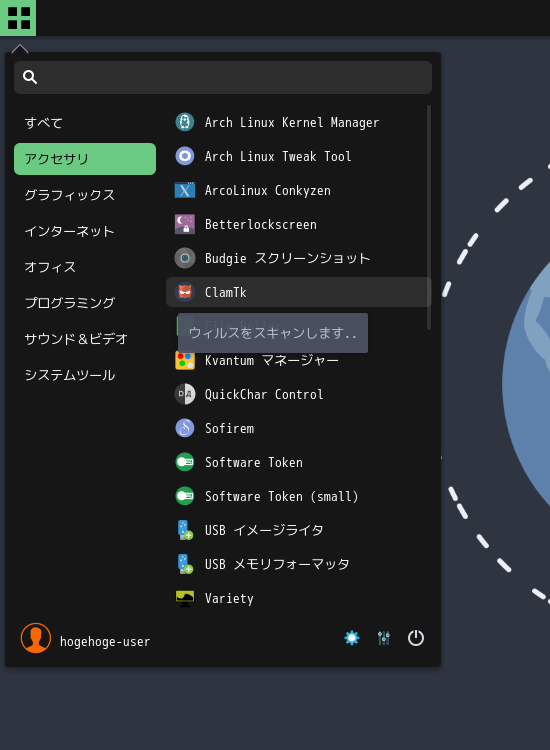 1. 概要 「ClamTk」は、「GUI」で操作するアンチウィルスソフトです。 2. インストール 「Pamac」で、「clamtk」を検索して、インストールします。 3. 起動 「スタート」→「アクセサリ」→「ClamTk」