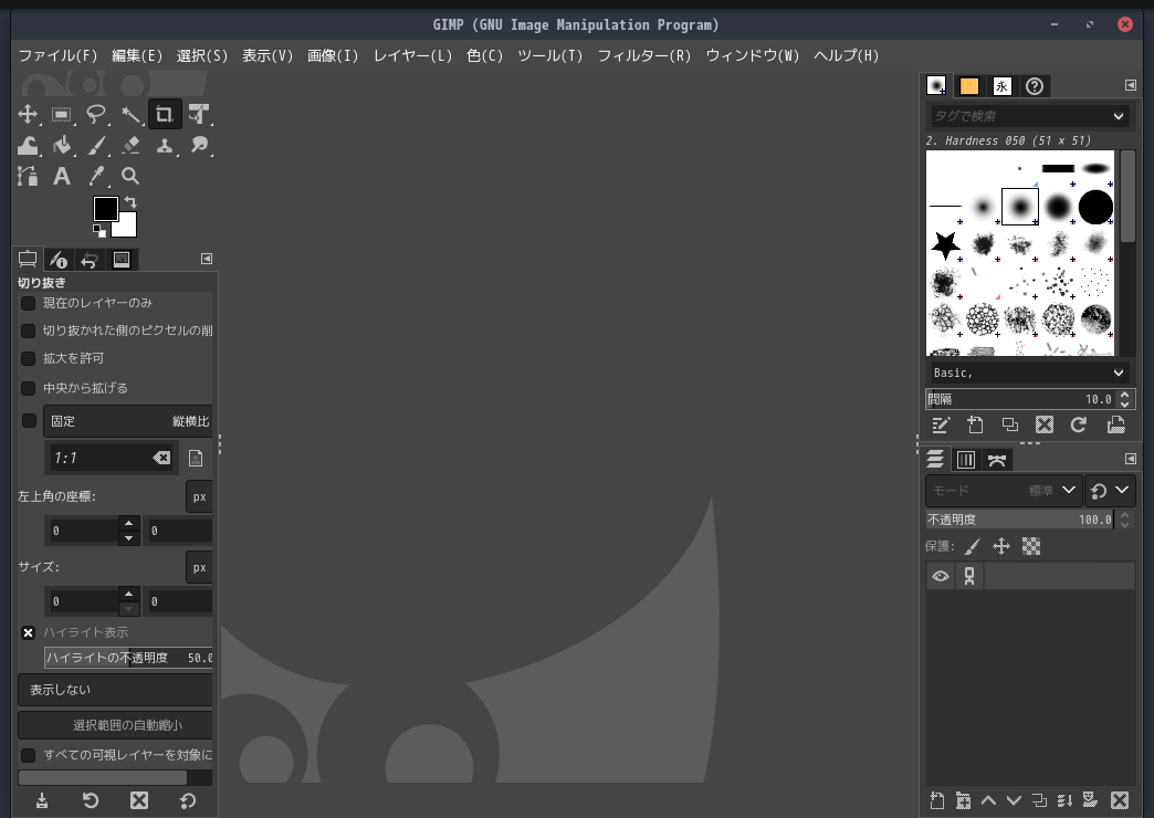 起動直後の状態です。 2024年8月20日の時点で、下記のバージョンでした。 操作については、「画像編集ソフト GIMP2」に掲載しています。 上記は簡単なものですので、詳細なものがほしい方は、各所に初歩の手引きから応用編までありますので、そちらを参考にしてください。 |