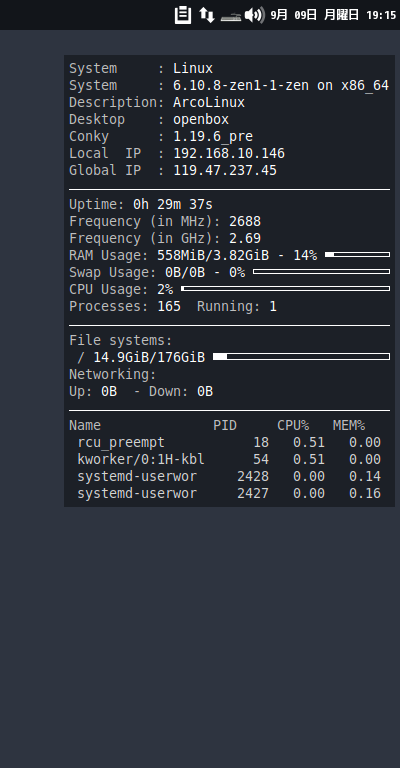 「ArcoLinux」では、「Conky」は、デフォルトでインストールされています。