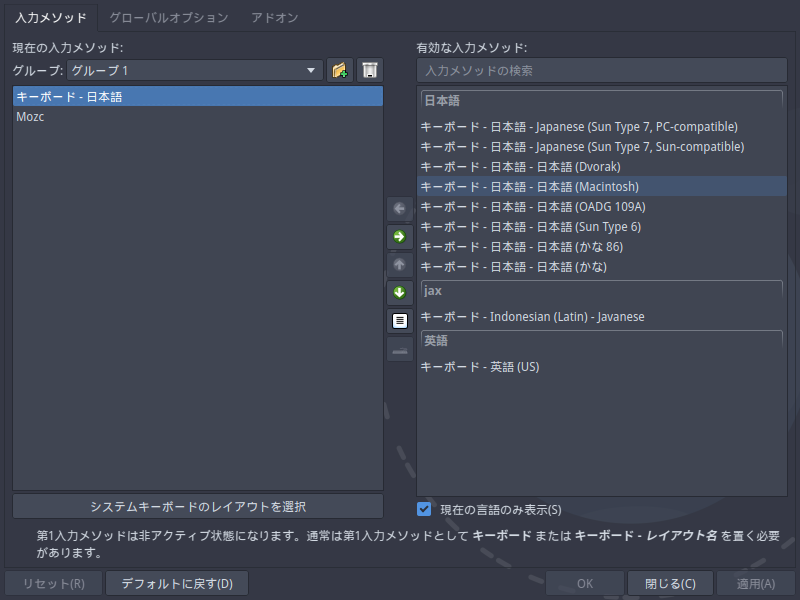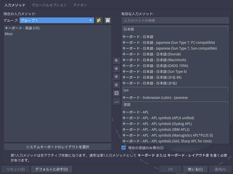 日本語入力として、「fcitx5-mozc」をインストールして使用します。