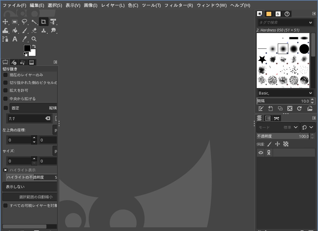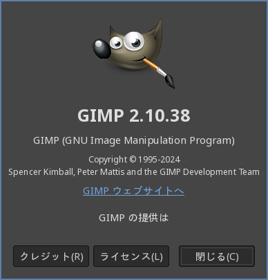 起動直後の状態です。 2024年8月23日の時点で、下記のバージョンでした。 操作については、「画像編集ソフト GIMP2」に掲載しています。 上記は簡単なものですので、詳細なものがほしい方は、各所に初歩の手引きから応用編までありますので、そちらを参考にしてください。 |