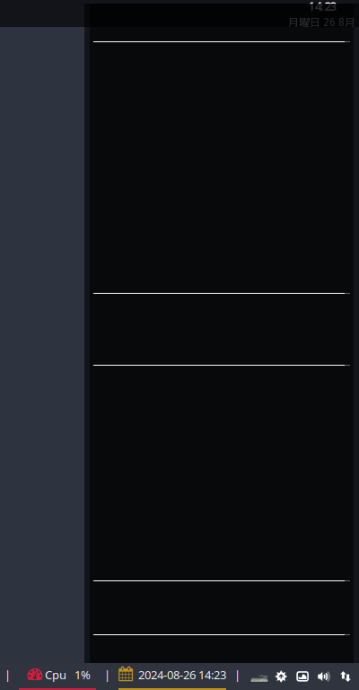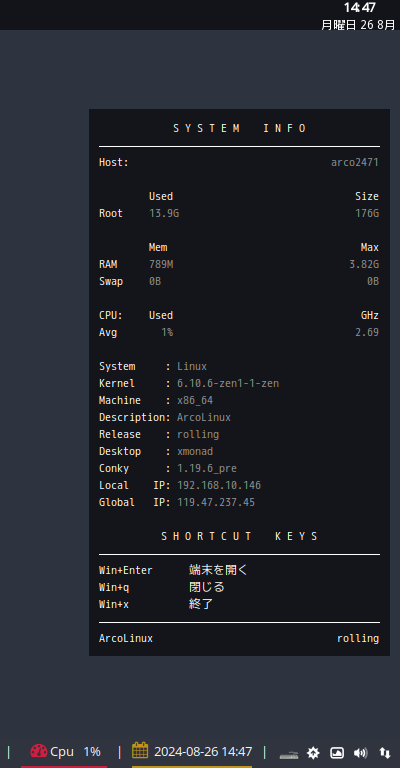 「システム情報」「ディストリビューション」「デスクトップ」「Conky バージョン情報」「IP アドレス」を複数行で表示します。