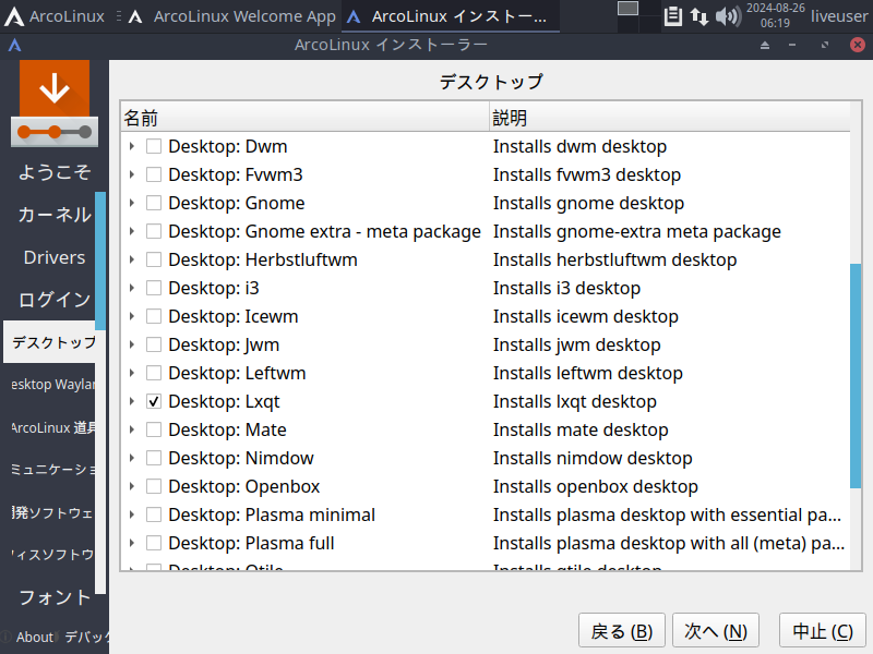 1. 概要 インストールに関しては、「ArcoLinux - 24.07.01 - 概要・共通事項」をご参照ください。 2. インストール インストール時に、デスクトップ選択画面で、「LXQt」を選択します。