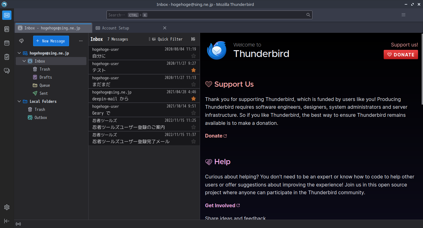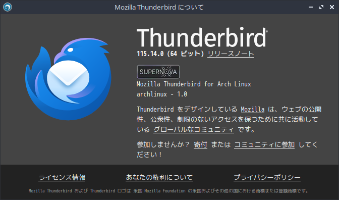 初回起動時は、「アカウント設定」が起動します。 起動直後に、受信ボックスを開いた状態です。 2024年8月27日の時点で、下記のバージョンでした。 日本語化を含め、操作方法等は「メールクライアント - Thunderbird」をご参照ください。 |