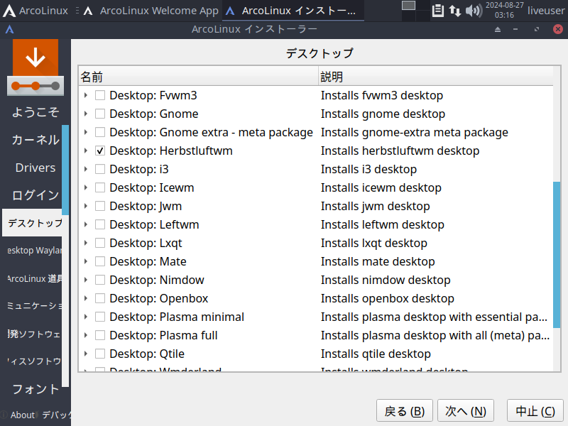 1. 概要 インストールに関しては、「ArcoLinux - 24.07.01 - 概要・共通事項」をご参照ください。 2. インストール インストール時に、デスクトップ選択画面で、「herbstluftwm」を選択します。