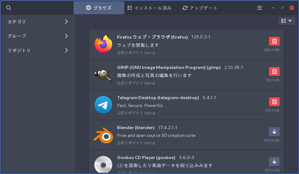 1. 概要 パッケージ管理フロントエンドとして「Pamac」を使用します。 2. インストール 「root」ユーザ権限で。 yes | pacman -S pamac-aur 3. 起動 「スタート」→「システム」→「ソフトウェアの追加と削除」
