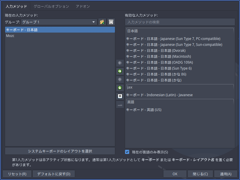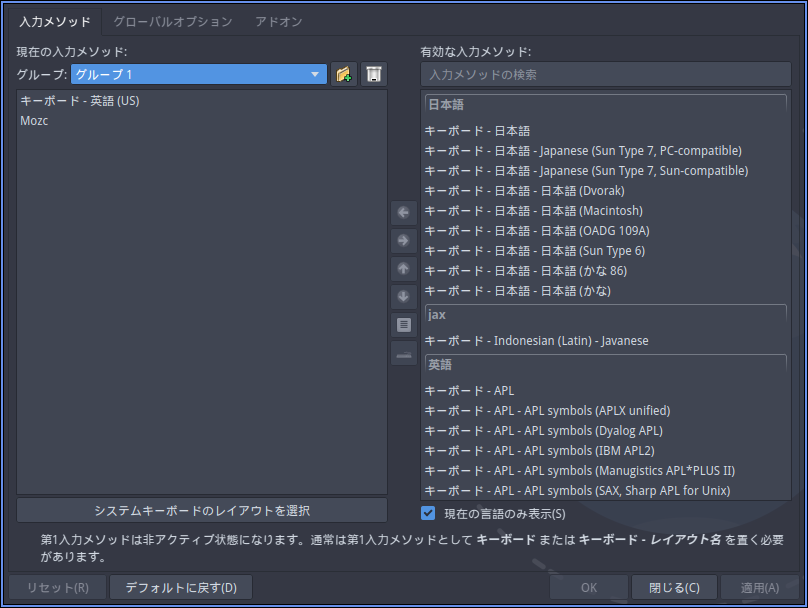 日本語入力として、「fcitx5-mozc」をインストールして使用します。
