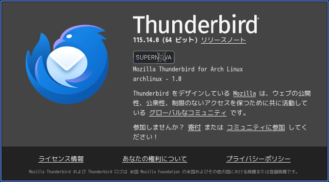 初回起動時は、「アカウント設定」が起動します。 起動直後に、受信ボックスを開いた状態です。 2024年8月27日の時点で、下記のバージョンでした。 日本語化を含め、操作方法等は「メールクライアント - Thunderbird」をご参照ください。 |