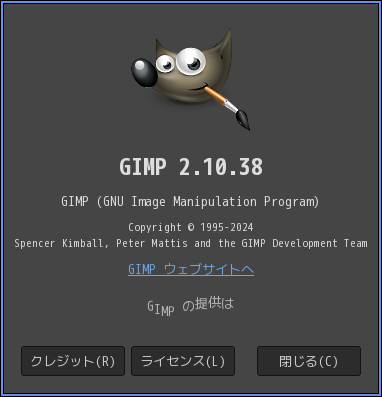 起動直後の状態です。 2024年8月27日の時点で、下記のバージョンでした。 操作については、「画像編集ソフト GIMP2」に掲載しています。 上記は簡単なものですので、詳細なものがほしい方は、各所に初歩の手引きから応用編までありますので、そちらを参考にしてください。 |