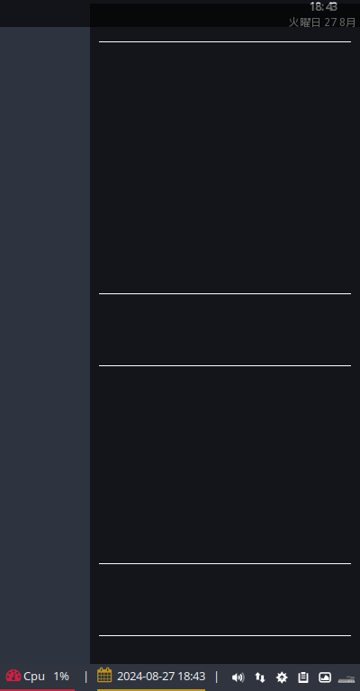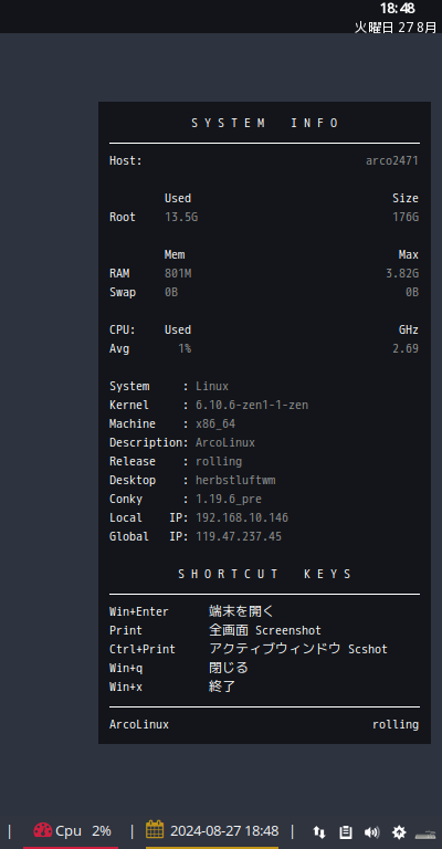 ショートカットキー表示の前に、「システム情報」「ディストリビューション」「デスクトップ」「Conky バージョン情報」「IP アドレス」を複数行で表示します。