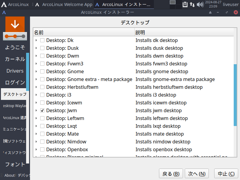 1. 概要 インストールに関しては、「ArcoLinux - 24.07.01 - 概要・共通事項」をご参照ください。 2. インストール インストール時に、デスクトップ選択画面で、「JWM」を選択します。