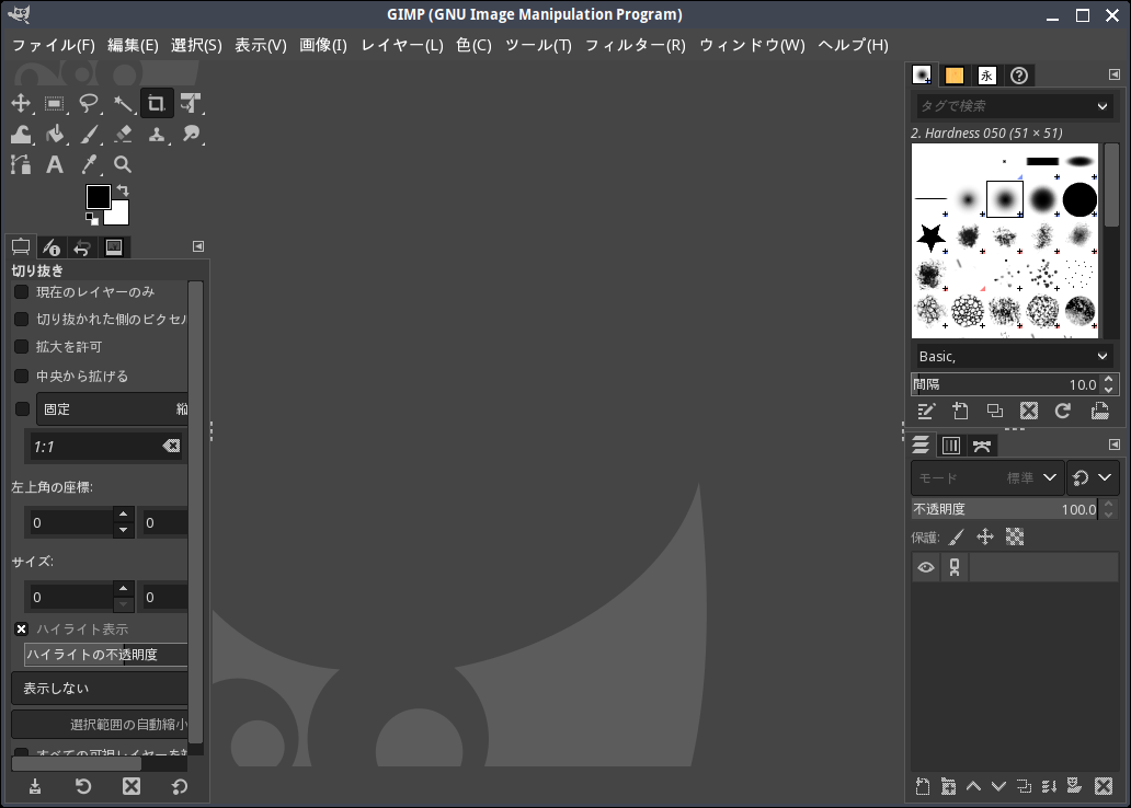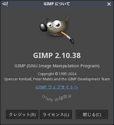 起動直後の状態です。 2024年8月28日の時点で、下記のバージョンでした。 操作については、「画像編集ソフト GIMP2」に掲載しています。 上記は簡単なものですので、詳細なものがほしい方は、各所に初歩の手引きから応用編までありますので、そちらを参考にしてください。 |