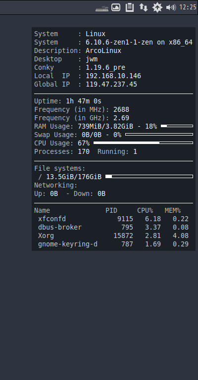「ArcoLinux」では、「Conky」は、デフォルトでインストールされています。