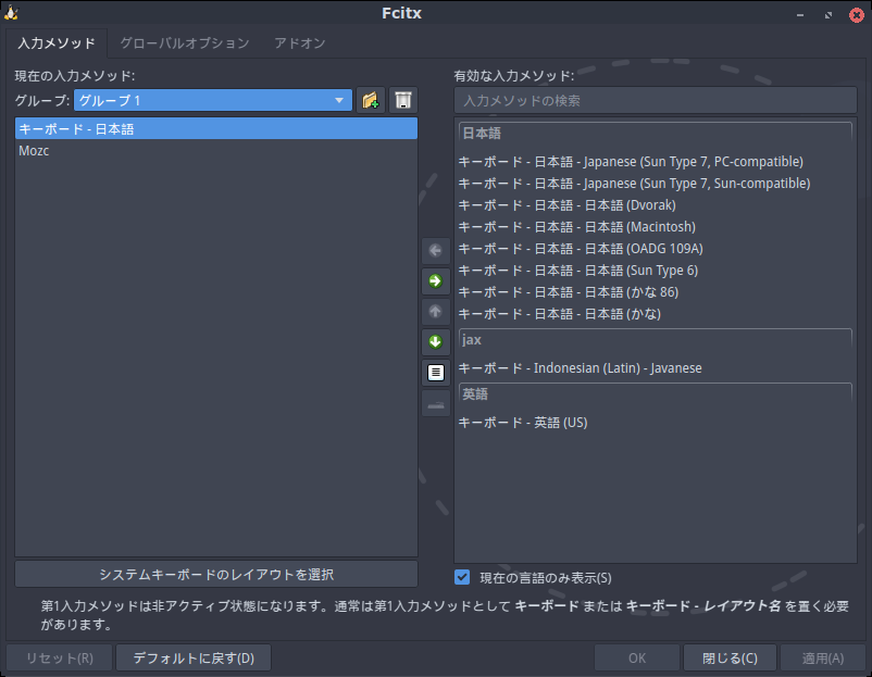 日本語入力として、「fcitx5-mozc」をインストールして使用します。