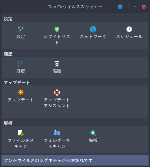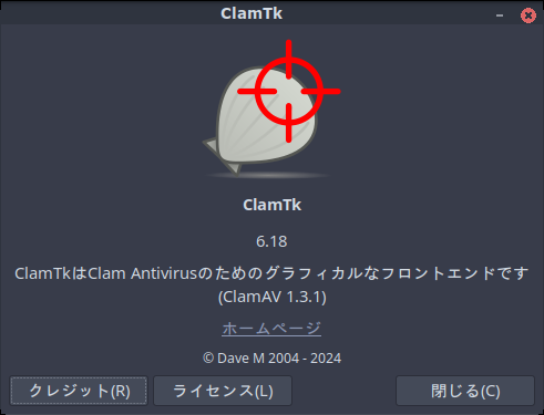 1. 概要 「ClamTk」は、「GUI」で操作するアンチウィルスソフトです。 2. インストール 「Pamac」で、「clamtk」を検索して、インストールします。 3. 起動 「スタート」→「アクセサリ」→「ClamTk」