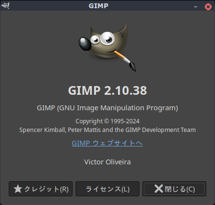起動直後の状態です。 2024年8月28日の時点で、下記のバージョンでした。 操作については、「画像編集ソフト GIMP2」に掲載しています。 上記は簡単なものですので、詳細なものがほしい方は、各所に初歩の手引きから応用編までありますので、そちらを参考にしてください。 |