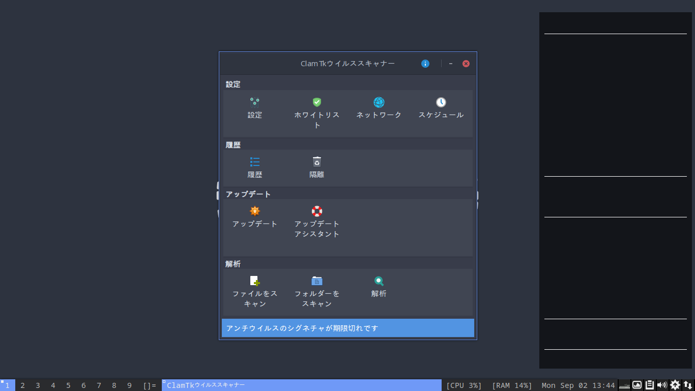 1. 概要 「ClamTk」は、「GUI」で操作するアンチウィルスソフトです。 2. インストール 「Pamac」で、「clamtk」を検索してインストールします。 3. 起動 「スタート」→「アクセサリ」→「ClamTk」