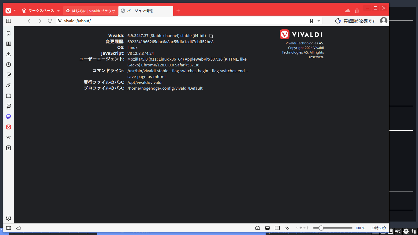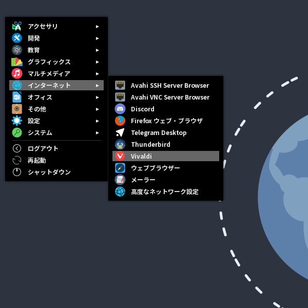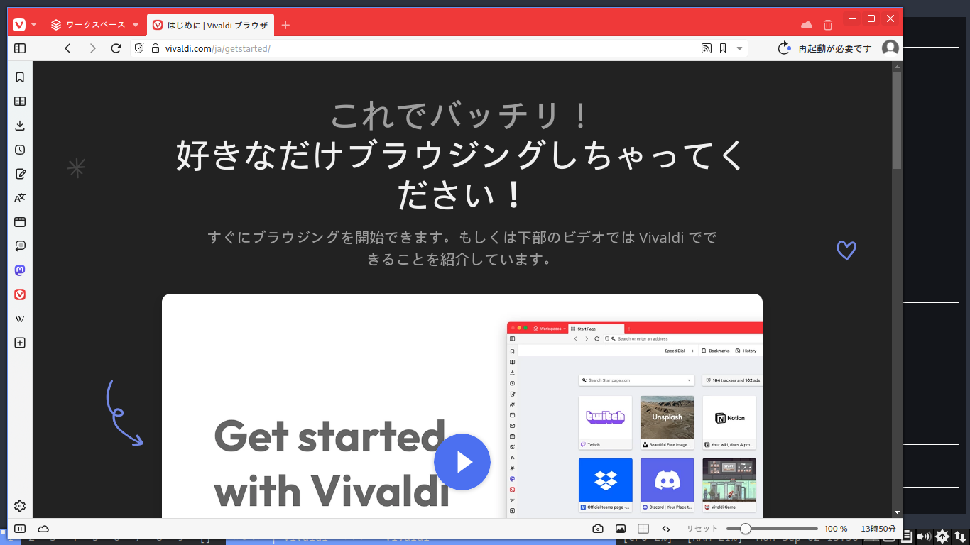 1. 概要 ブラウザとして、「Vivaldi」を使用します。 システムインストール時に選択していれば、デフォルトでインストールされています。 前回、「dwm」では、まともに表示されていなかったのですが、今回は、大丈夫なようです。 2. 起動 「スタート」→「インターネット」→「Vivaldi」