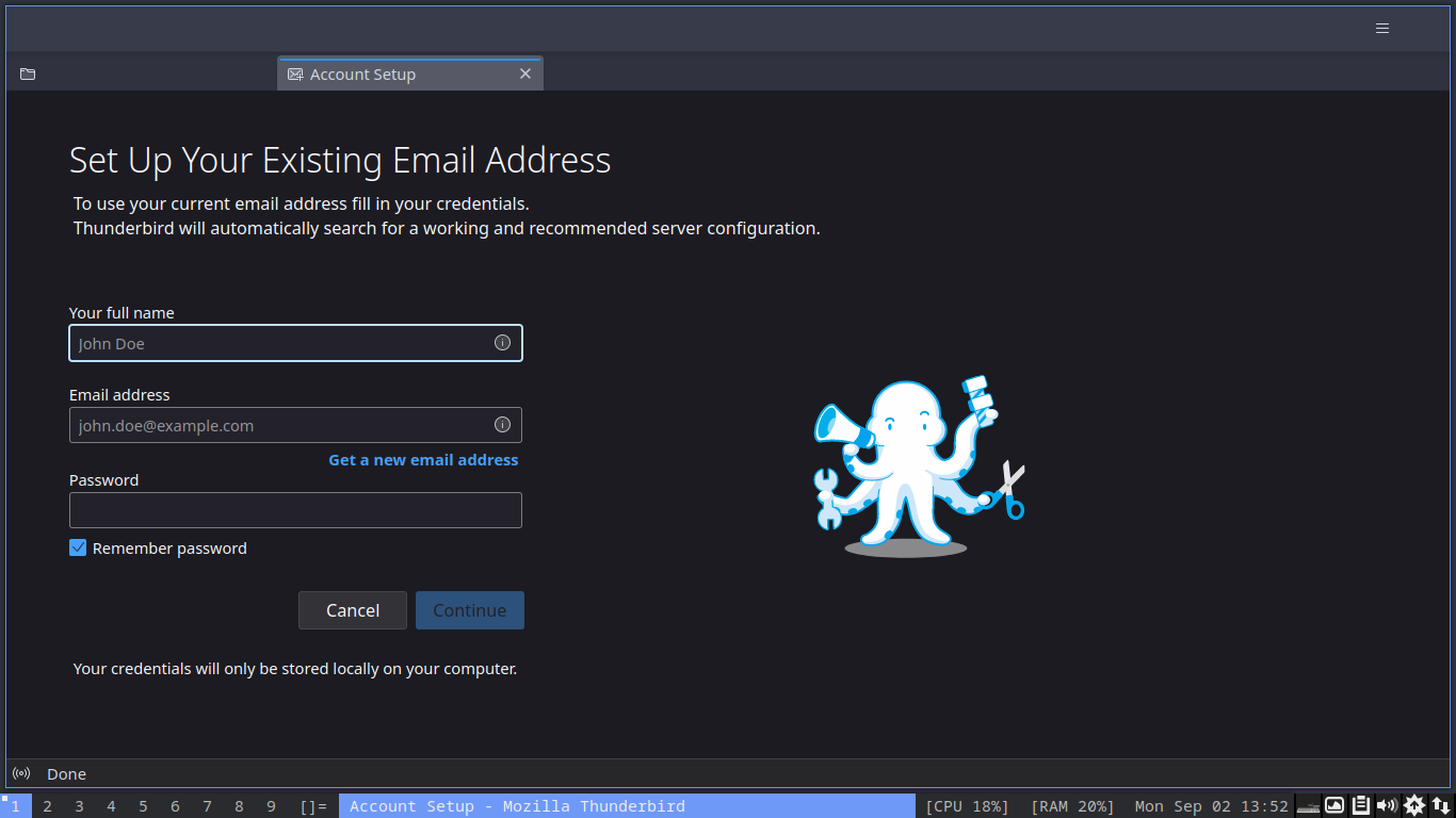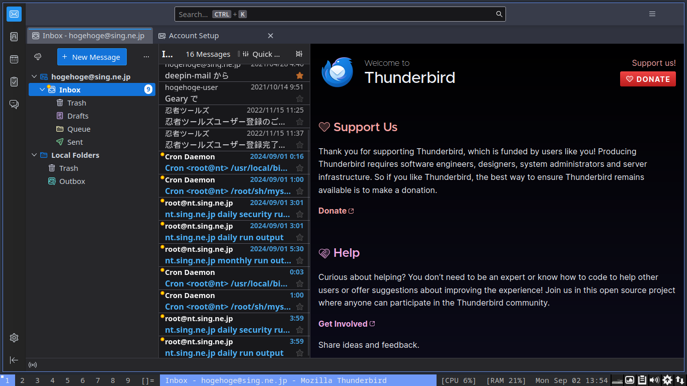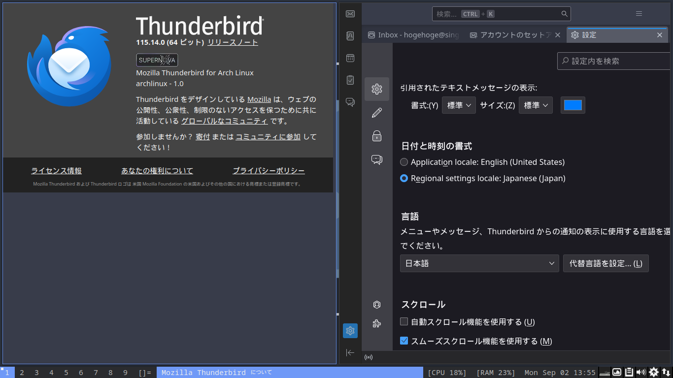ArcoLinux - 24.07.01 - dwm - メールクライアント Thunderbird