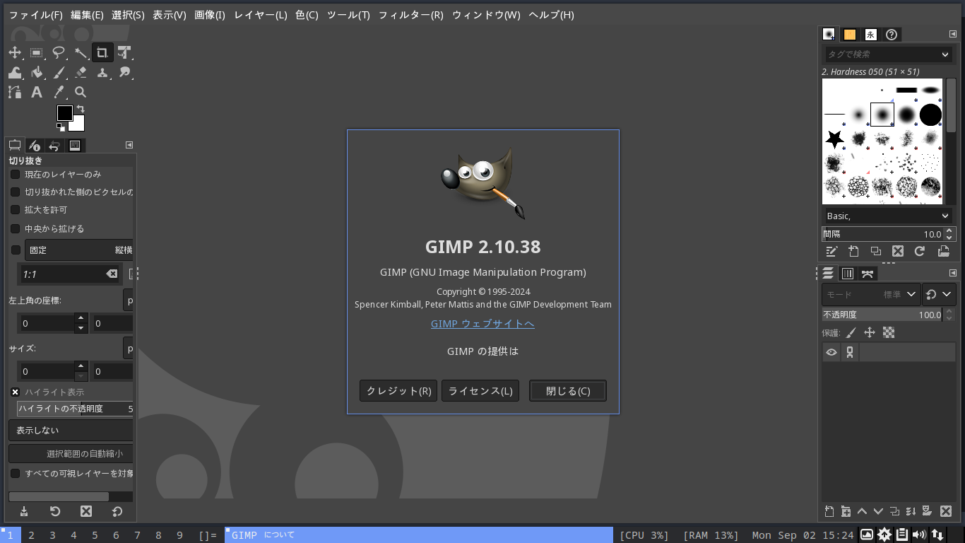 起動直後の状態です。 2024年9月2日の時点で、下記のバージョンでした。 操作については、「画像編集ソフト GIMP2」に掲載しています。 上記は簡単なものですので、詳細なものがほしい方は、各所に初歩の手引きから応用編までありますので、そちらを参考にしてください。 |