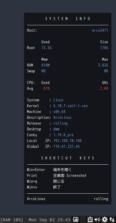 ショートカットキー表示の前に、「システム情報」「ディストリビューション」「デスクトップ」「Conky バージョン情報」「IP アドレス」を複数行で表示します。