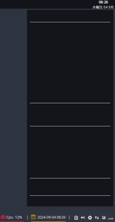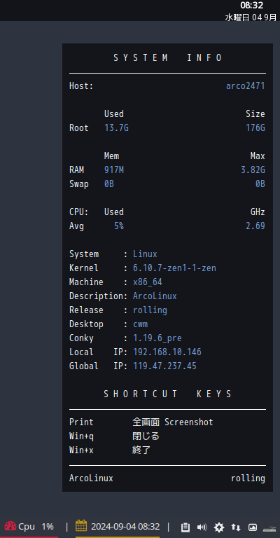 ショートカットキー表示の前に、「システム情報」「ディストリビューション」「デスクトップ」「Conky バージョン情報」「IP アドレス」を複数行で表示します。