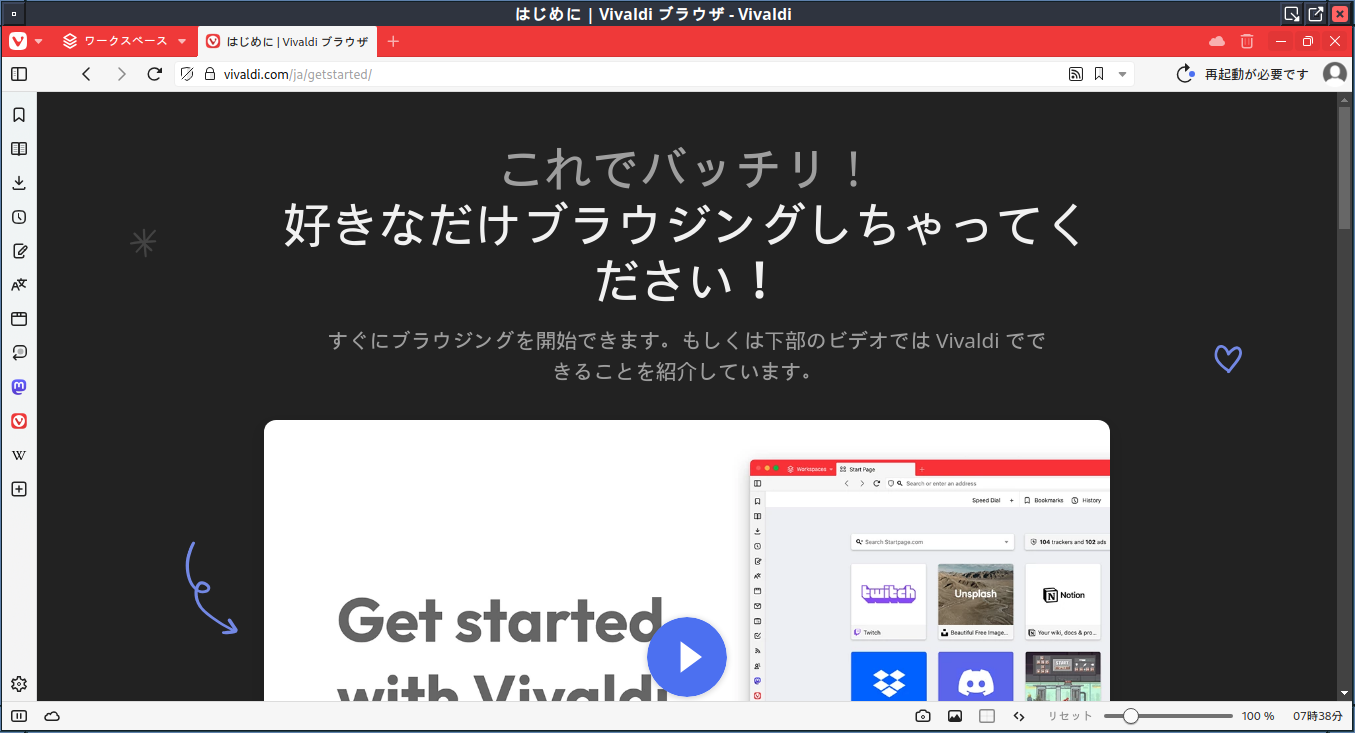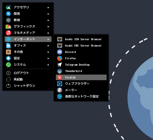 1. 概要 ブラウザとして、「Vivaldi」を使用します。 システムインストール時に選択していれば、デフォルトでインストールされています。 2. 起動 「デスクトップ上クリック」→「インターネット」→「Vivaldi」