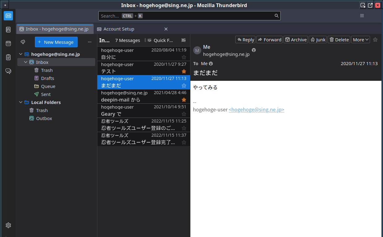 初回起動時は、「アカウント設定」が起動します。 起動直後の状態です。 2024年9月6日の時点で、下記のバージョンでした。 日本語化を含め、操作方法に関しては「メールクライアント - Thunderbird」をご参照ください。 |